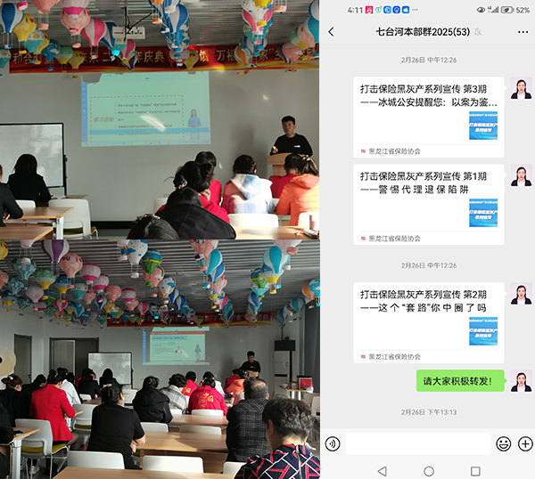 在此次打擊“代理退?!毙麄骰顒又?,七臺河中支利用微信工作群、微信朋友圈轉(zhuǎn)發(fā)宣傳內(nèi)容,詳細(xì)剖析了黑灰產(chǎn)的常見運作模式,非法“代理退?!笨赡芙o消費者帶來的四方面風(fēng)險:一是資金受損風(fēng)險;二是喪失正常保險保障的風(fēng)險;三是個人信息泄漏風(fēng)險;四是相關(guān)行為可能導(dǎo)致消費者面臨訴訟等法律風(fēng)險。號召廣大群眾增強風(fēng)險防范意識,警惕非法“代理退?!碧茁?。