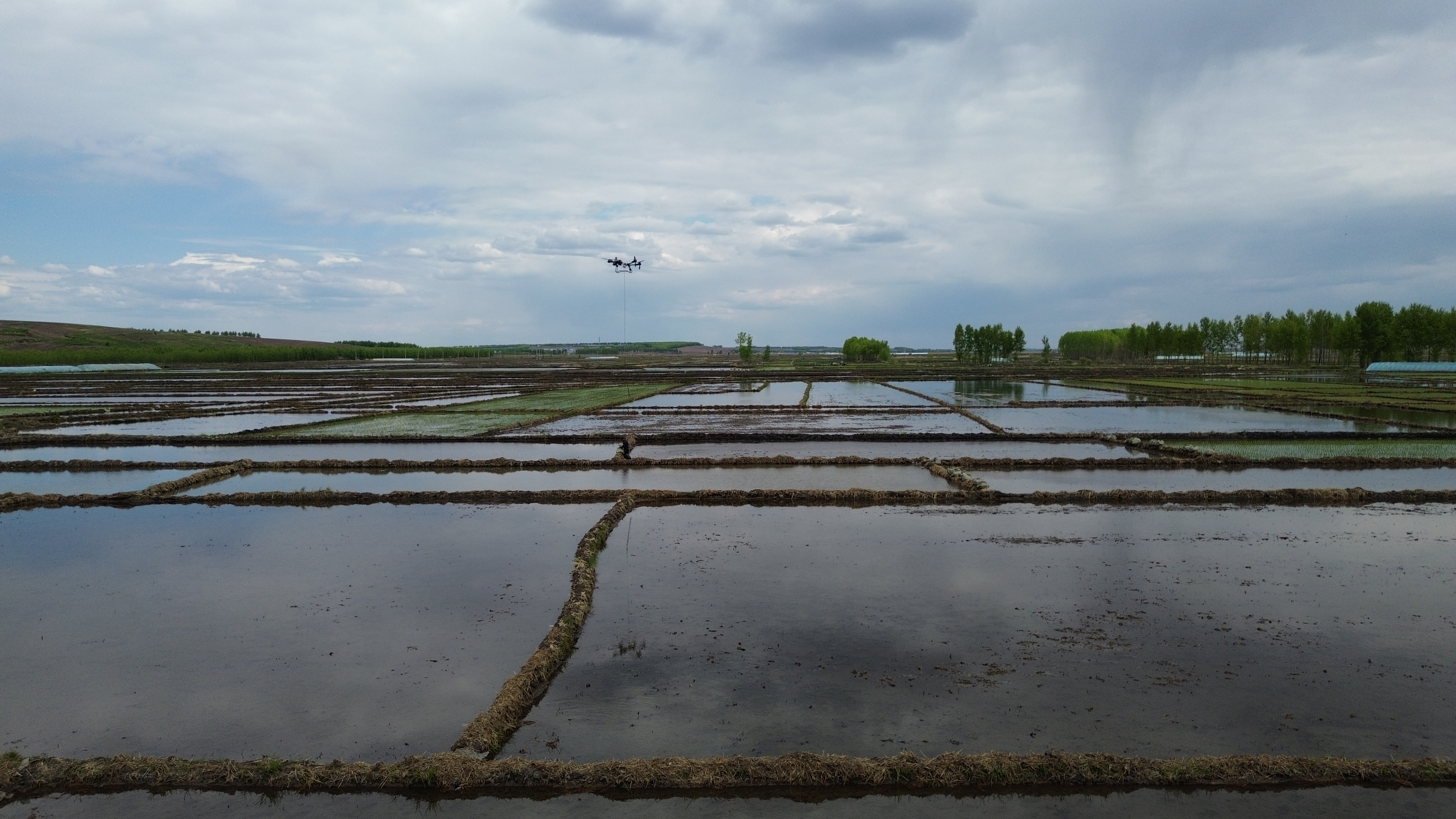 在光榮鄉(xiāng)1.4萬畝稻田區(qū),機械化作業(yè)與智能設(shè)配的配合成為春耕焦點。在水田作業(yè)現(xiàn)場,插秧機勻速行進,秧苗以均勻的間距和深度整齊入泥;無人機則沿規(guī)劃航線精準運送秧苗箱,實現(xiàn)了從“人工運秧”到“空中補給”的升級。機械化作業(yè)確保了株距、深度的標準化,為秧苗的扎根生長奠定基礎(chǔ)。放眼望去,成行的秧苗如綠色線條在田野鋪展,很是壯觀。