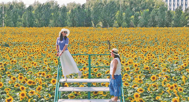近日,哈爾濱市東方學(xué)院的校園里,30萬(wàn)株向日葵進(jìn)入盛花期,層層疊疊的金黃花瓣在校園里組成金色矩陣,連蜂蝶振翅都沾滿蜜糖色的光斑。風(fēng)掠過(guò)時(shí),葉片翻卷出翡翠色的浪涌,花盤(pán)碰撞發(fā)出細(xì)雨般的窸窣聲,空氣里浮動(dòng)著類(lèi)似烤面包的溫暖香氣?;êig的小橋上,愛(ài)花的市民在這里打卡拍照,定格最美瞬間。