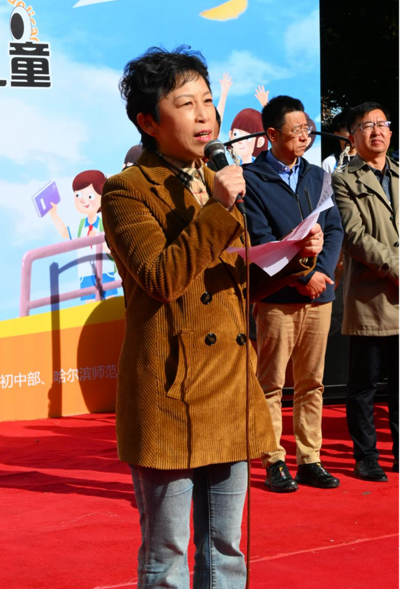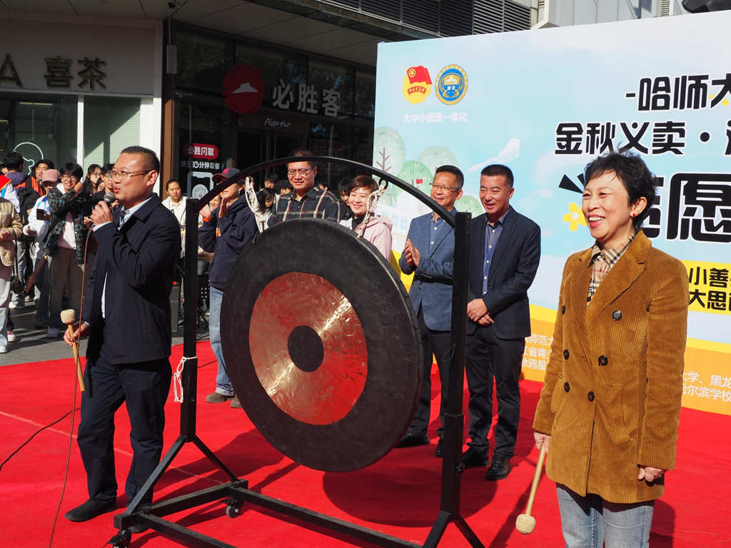 受贈(zèng)方香坊區(qū)幸福鎮(zhèn)哈藥希望小學(xué)校長劉壯現(xiàn)場介紹了這所希望小學(xué)留守兒童的情況。開幕式最后,黃磊理事長和張靜萍書記一同敲響大鑼,鳴鑼開市。