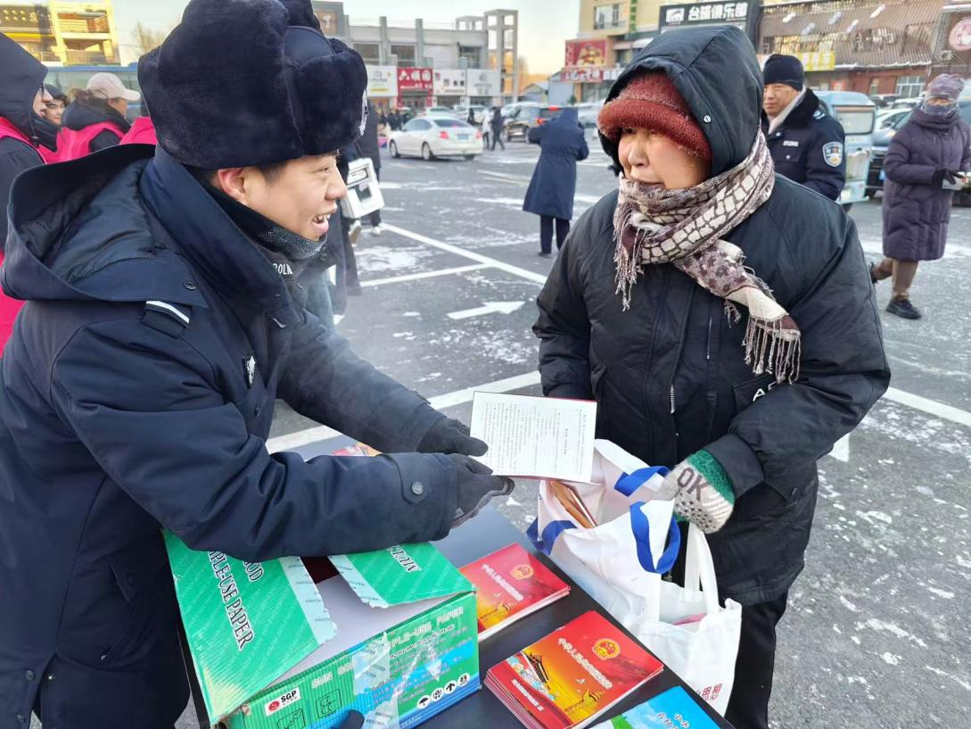 冰天雪地中,民輔警搓著凍紅的雙手仍微笑宣講,逐份發(fā)放《中華人民共和國憲法》讀本、法治折頁與防范指南?!斑@么冷的天還出來送法律知識,這些知識很實用,拿回去也讓家里人學學”,市民李大爺?shù)母锌莱隽巳罕娦穆?,現(xiàn)場咨詢、聆聽的群眾絡繹不絕,秩序井然。