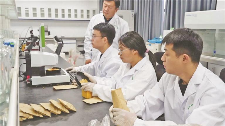 在國家現(xiàn)代農(nóng)業(yè)產(chǎn)業(yè)園的實驗室,來自東北農(nóng)業(yè)大學(xué)的研究生正在對大豆種子進行電腦數(shù)粒、離心分析密度等工作,為選育出高產(chǎn)、優(yōu)質(zhì)、多抗的專用大豆品種提供基礎(chǔ)數(shù)據(jù)支撐。