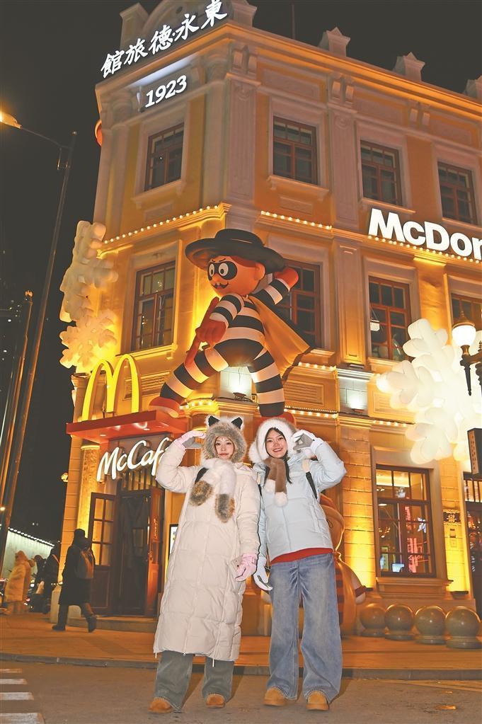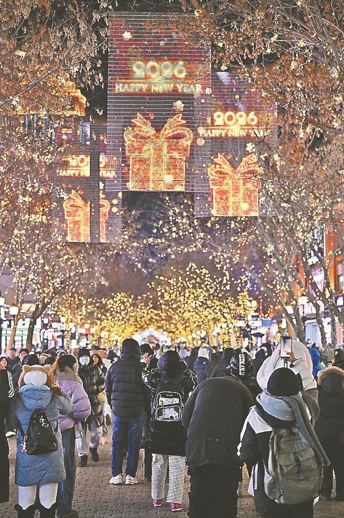 哈爾濱中央大街化身光影盛宴與煙火市集。以“瑞馬迎新”為主題的創(chuàng)意燈飾點(diǎn)亮了這條百年老街,動(dòng)態(tài)飛馬踏星而行的造型靈動(dòng)逼真,“馬上鴻運(yùn)”樹(shù)燈牌流光溢彩,與街區(qū)內(nèi)的歐式建筑輪廓交相輝映,勾勒出一幅夢(mèng)幻的冬日夜景。面包石鋪就的街道上人潮涌動(dòng),來(lái)自五湖四海的人們肩并肩、手牽手,共赴這場(chǎng)跨年之約。