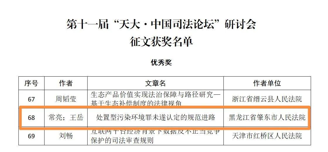 黑龍江經(jīng)濟(jì)網(wǎng)訊(董慧瑩 李雪松)近日,由中國行為法學(xué)會司法專業(yè)委員會主辦、天津大學(xué)承辦的第十一屆“天大·中國司法論壇”研討會征文獲獎名單公布。本次征文活動共收到投稿論文620篇,經(jīng)評委會嚴(yán)格評審,共選出一等獎8個、二等獎24個、三等獎48個、優(yōu)秀獎102個。其中,肇東市人民法院審管辦副主任常亮、審管辦書記員王岳撰寫的學(xué)術(shù)論文《處置型污染環(huán)境罪未遂認(rèn)定的規(guī)范進(jìn)路》榮獲優(yōu)秀獎。